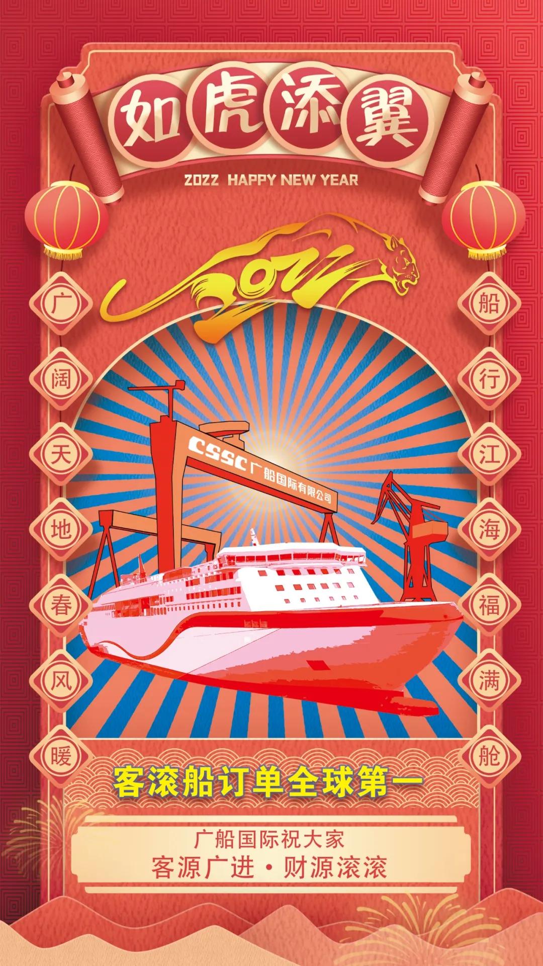 以門為前景,郵輪在海上乘風(fēng)破浪,寓意中國首制大型郵輪建造能取得開門紅!以紅色為背景,表達(dá)新年喜慶的節(jié)日氛圍,也祝福祖國郵輪產(chǎn)業(yè)的發(fā)展紅紅火火,蒸蒸日上!