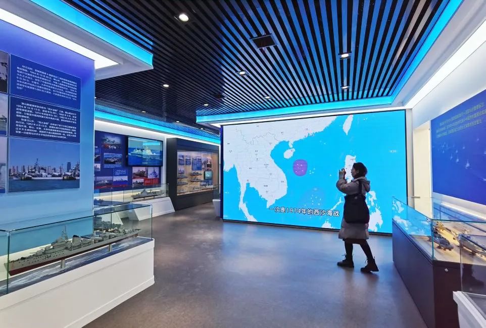 現(xiàn)代海軍裝備主題展館分室內(nèi)、室外兩個展區(qū),設(shè)立六個篇章,重點(diǎn)展示了人民海軍成立以來艦船裝備從沿岸近海到走向深遠(yuǎn)海的代表成果。除圖文影視、模型外,展覽還引入了航母艦載機(jī)起降虛擬體驗、海盜射擊游戲、艦載機(jī)起飛指揮等多個體驗互動類項目。