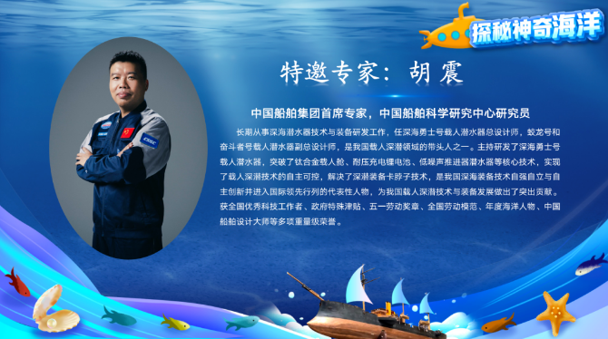3月22日,由山東省大中小學(xué)海洋文化教育研究指導(dǎo)中心、中國海洋大學(xué)等單位聯(lián)合主辦的“探秘神奇海洋”云端科普活動(dòng)的重點(diǎn)板塊之一——“深海探索”直播正式開播。中國船舶集團(tuán)首席專家、中國船舶集團(tuán)七〇二所研究員胡震在直播間為廣大觀眾答疑解惑,近6萬名觀眾觀看直播并提出了各類關(guān)于深海的問題。