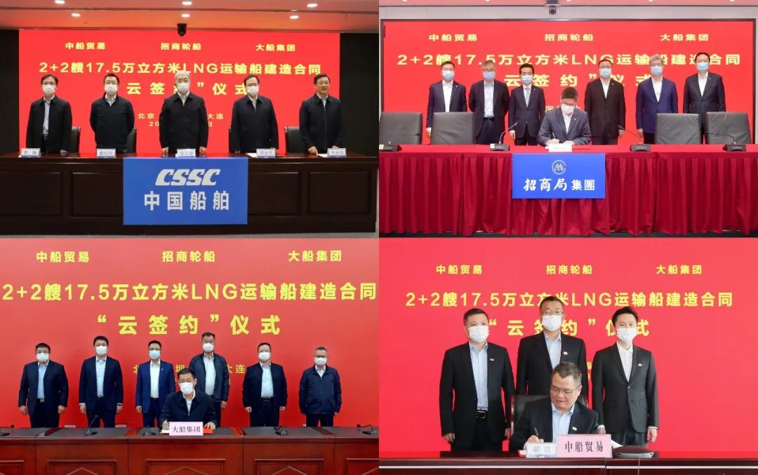 3月31日,中國(guó)船舶集團(tuán)有限公司旗下大船集團(tuán)聯(lián)合中船貿(mào)易與招商局集團(tuán)有限公司旗下招商輪船在上海、深圳、大連及北京四地以“云簽約”方式簽署2+2艘17.5萬(wàn)立方米大型液化天然氣(LNG)運(yùn)輸船建造合同。中國(guó)船舶集團(tuán)黨組書記、董事長(zhǎng)雷凡培,黨組副書記、總經(jīng)理?xiàng)罱鸪?,黨組成員、副總經(jīng)理盛紀(jì)綱,招商局集團(tuán)董事長(zhǎng)繆建民、總經(jīng)理胡建華、董事王宏出席簽約儀式。雷凡培、繆建民在儀式上致辭。