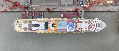 目前艙室、餐飲等區(qū)域的內(nèi)裝工程基本接近尾聲,乘客梯道、影院劇場(chǎng)、中庭廣場(chǎng)、水上樂(lè)園、高空繩索運(yùn)動(dòng)項(xiàng)目等公共區(qū)域建成或基本建成,整體進(jìn)度達(dá)到95%。