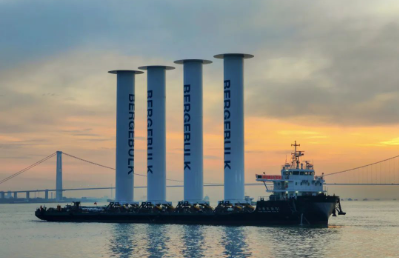 由中船澄西為Anemoi Marine Technologies公司建造的4套35米折疊式船用轉(zhuǎn)子帆,將安裝在一艘388000載重噸Valemax型礦砂船上,可以從垂直方向降低可折疊旋筒風(fēng)帆,以減輕對(duì)氣流和貨物裝卸操作的影響。
