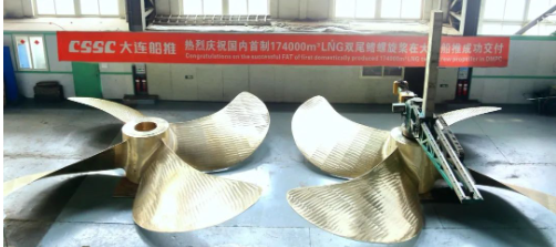 大連公司下屬大連船推成功交付自主開發(fā)設(shè)計制造的17.4萬立方米LNG運輸船雙尾鰭螺旋槳。