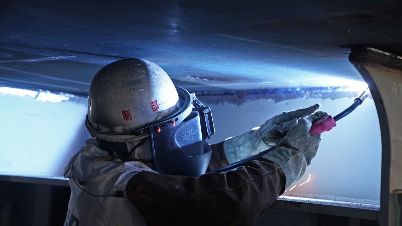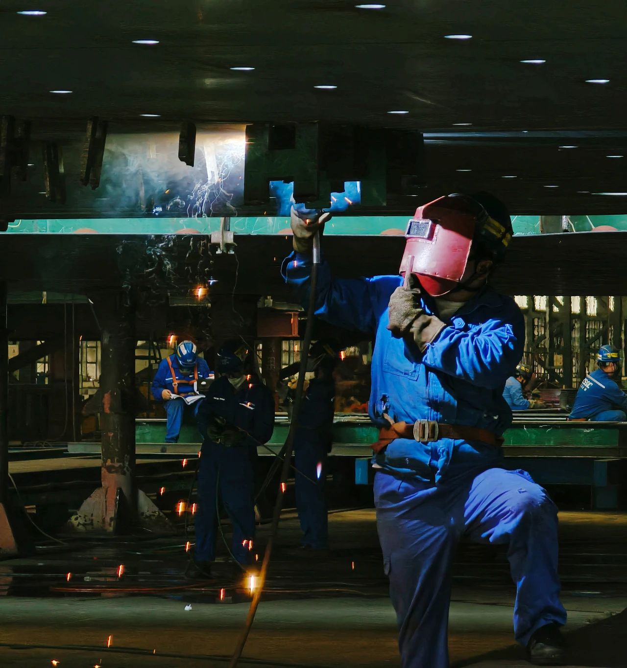 廣船國(guó)際——焊工正在開展分段焊接施工。