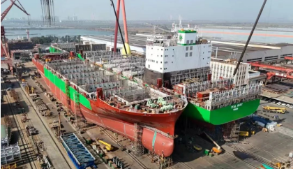 黃埔文沖切實(shí)增強(qiáng)自主開發(fā)能力,堅(jiān)持聚焦主建船型,持續(xù)推廣自主開發(fā)的“鴻鵠”集裝箱船和“海鯨”散貨船系列,成功打造1900TEU集裝箱船、3000TEU集裝箱船、2400TEU甲醇雙燃料集裝箱船和85000噸散貨船等明星船型,形成品牌迭代升級(jí)和譜系化;緊抓船舶行業(yè)綠色新能源的機(jī)遇,黃埔文沖以市場(chǎng)需求為導(dǎo)向,承接了多艘以甲醇、氨燃料等綠色能源為動(dòng)力的集裝箱船和散貨船訂單。