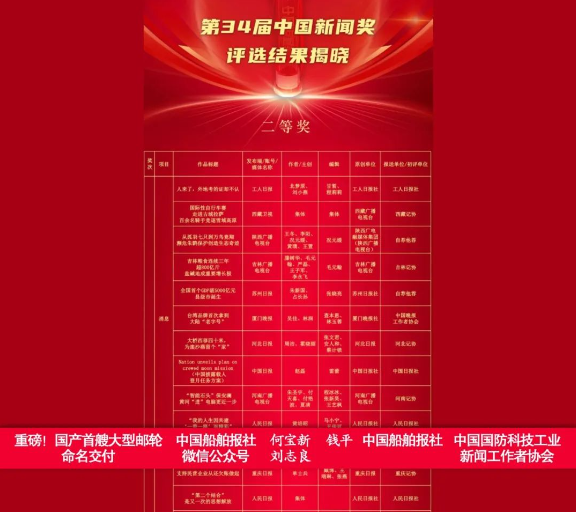 11月7日,中華全國新聞工作者協(xié)會主辦的第34屆中國新聞獎評選結(jié)果揭曉。中國國防科技工業(yè)新聞工作者協(xié)會推薦中國船舶報(bào)社特約記者何寶新、記者劉志良主創(chuàng)、錢平編輯的作品《重磅!國產(chǎn)首艘大型郵輪命名交付》獲消息類二等獎。