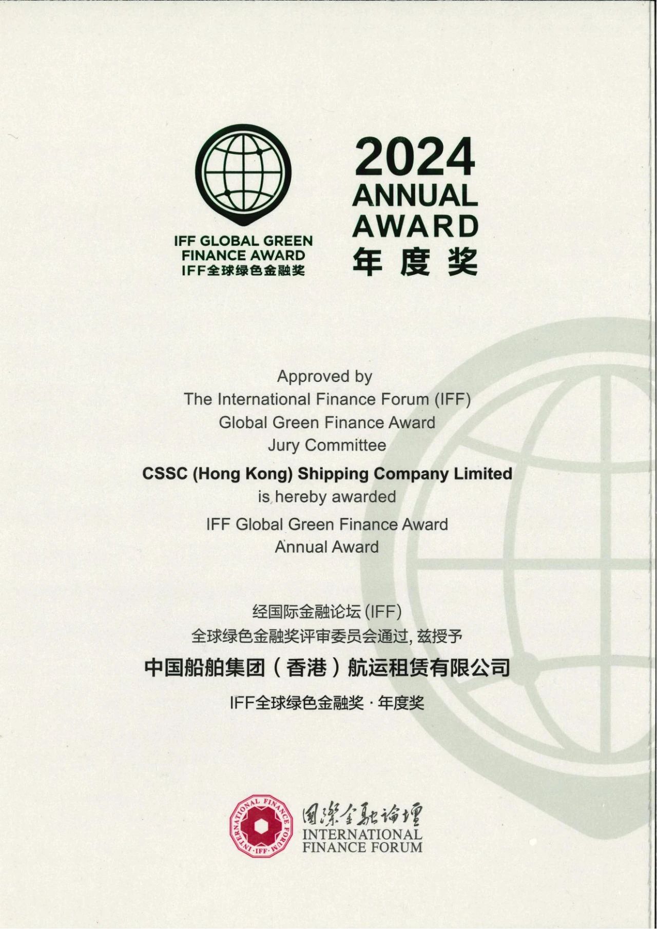 日前,在中國香港舉行的國際金融論壇(IFF)第21屆全球年會(F20峰會)上,發(fā)布了第五屆“IFF全球綠色金融獎”評選結(jié)果。中國船舶集團(tuán)中船租賃憑借其在綠色金融領(lǐng)域綜合實踐的杰出表現(xiàn),首度榮膺“IFF全球綠色金融獎——年度獎”。這是繼2021年獲得“IFF全球綠色金融創(chuàng)新獎”,中船租賃再上一層樓,榮獲年度大獎。