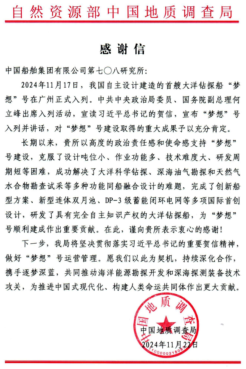 中國地質調查局在信中對中國船舶集團七〇八所在“夢想”號立項論證、研發(fā)設計、建造調試等階段所做的突出工作和卓越貢獻表示感謝。