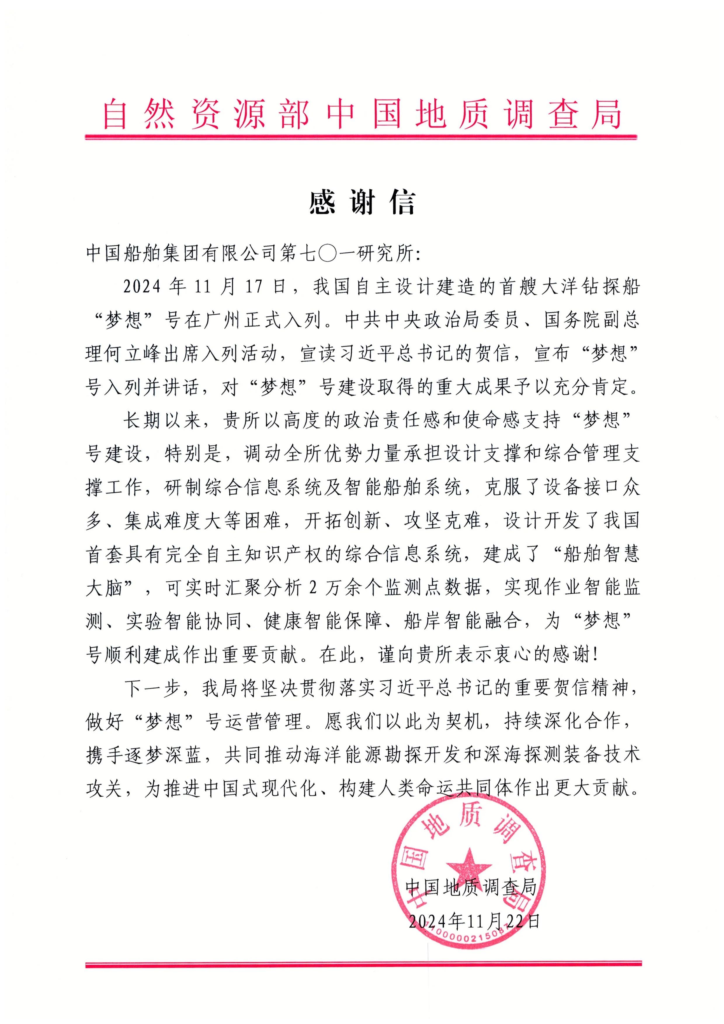 中國地質調查局在信中對中國船舶集團七〇一所在“夢想”號設計支撐和綜合管理支撐、綜合信息系統(tǒng)及智能船舶系統(tǒng)研制等方面所做的重要貢獻表示感謝。