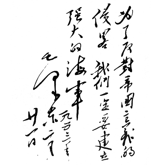 1953年2月19日,毛澤東在武漢登上長(zhǎng)江艦視察長(zhǎng)江中下游四省,并在長(zhǎng)江艦上為海軍題詞:“為了反對(duì)帝國(guó)主義的侵略,我們一定要建立強(qiáng)大的海軍?!贝葱兄聊暇?,毛澤東提出要在南京檢閱海軍戰(zhàn)艦。華東海軍立即抽調(diào)了“廣州”號(hào)和“南昌”號(hào)護(hù)衛(wèi)艦、“黃河”號(hào)登陸艦,以及101號(hào)、104號(hào)魚(yú)雷艇參加檢閱。幾天中,毛澤東連續(xù)5次都寫(xiě)下同樣的題詞:“為了反對(duì)帝國(guó)主義的侵略,我們一定要建立強(qiáng)大的海軍”。這是中國(guó)領(lǐng)導(dǎo)人對(duì)建設(shè)強(qiáng)大海軍、建設(shè)一流裝備的殷切期望,是新生的中國(guó)對(duì)建設(shè)強(qiáng)大海防的決心。如今這顆刻著偉人囑托的銘石,靜靜矗立在江南造船長(zhǎng)興島造船基地行政樓前的草坪,也靜靜地矗立在每一位江南人的心中。