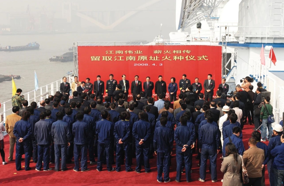 2008年4月,江南造船老廠建造的最后一艘船“遠(yuǎn)望6”號(hào)航天測(cè)量船即將交付。4月3日,時(shí)任江南造船搭載部部長(zhǎng)黃文飛作為取火者從“遠(yuǎn)望6”號(hào)船前甲板的上建位置手拿焊槍取火引燃火炬。火炬依次傳遞至勞動(dòng)模范、三八紅旗手、江南造船領(lǐng)導(dǎo)等,最后傳至?xí)r任中船集團(tuán)總經(jīng)理陳小津手中并由他點(diǎn)燃了火種盒。6月3日,江南造船人親手建造的船舶特地趕回“娘家”,載著江南“火種”駛往新基地,為新建造的產(chǎn)品開(kāi)工點(diǎn)火。