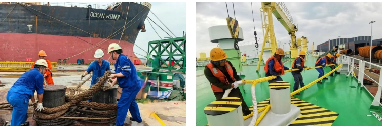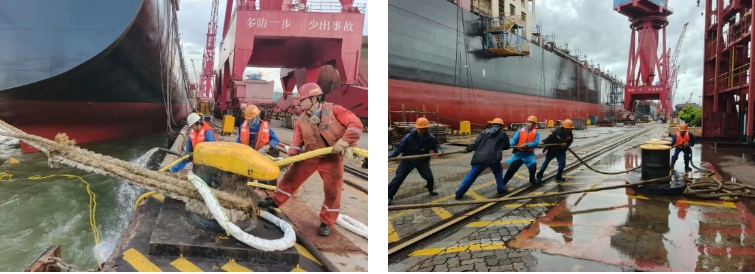 臺(tái)風(fēng)來(lái)臨前,聞“風(fēng)”而動(dòng)。緊急為單船加纜,將水上設(shè)備移入港池避風(fēng),拆除全部應(yīng)急梯,對(duì)纜樁開(kāi)展地毯式排查,預(yù)先部署防臺(tái)橫纜,筑牢前置防線。針對(duì)受風(fēng)面積大的大型集裝箱船等重點(diǎn)產(chǎn)品,升級(jí)加固措施,加裝高強(qiáng)度纜繩等,為巨輪系緊“安全鎖”。