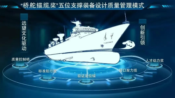 基于“全自主研發(fā)”和“巨系統(tǒng)抓總”的問題導(dǎo)向,七〇八所“遠(yuǎn)望”研發(fā)創(chuàng)新團(tuán)隊(duì)凝聚智慧和力量,以創(chuàng)新為引領(lǐng)、以遠(yuǎn)望文化為驅(qū)動(dòng),提煉了“橋、舵、錨、纜、槳”五位支撐裝備設(shè)計(jì)質(zhì)量管理模式。各項(xiàng)核心管理要素相互作用、五位支撐裝備研發(fā)設(shè)計(jì)過程,構(gòu)建形成了一個(gè)良好向上、持續(xù)提升的團(tuán)隊(duì)質(zhì)量管理機(jī)制,為確保裝備研制質(zhì)量奠定了堅(jiān)實(shí)基礎(chǔ)?!皹颉笔恰芭灅颉钡暮喎Q,是艦船駕駛控制、觀察及決策的主要設(shè)施,其作用如同質(zhì)量控制?!岸妗笔强刂婆灤叫蟹较虻闹饕O(shè)備,其作用如同規(guī)范指引?!板^”作為艦船停泊和定位的主要設(shè)備,其作用如同試驗(yàn)驗(yàn)證?!袄|”作為艦船靠幫連接的主要設(shè)備,其作用如同接口管理?!皹笔翘峁┡灤叫袆?dòng)力的主要設(shè)備,其作用如同人才保障。