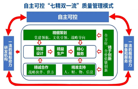 七一一所構(gòu)建的“自主可控‘七精雙一流’質(zhì)量模式”,以內(nèi)外雙循環(huán)為驅(qū)動(dòng),通過“七精”過程,達(dá)到“雙一流”目標(biāo),確保提供具有一流戰(zhàn)斗力標(biāo)準(zhǔn)的裝備和服務(wù)結(jié)果,實(shí)現(xiàn)了質(zhì)量管理的持續(xù)改進(jìn)與創(chuàng)新發(fā)展。該模式不僅為行業(yè)提供了成熟的管理借鑒,更通過重大型號(hào)項(xiàng)目研制和批量供貨的實(shí)踐,帶動(dòng)產(chǎn)業(yè)鏈配套供應(yīng)商踐行正向設(shè)計(jì)理念,建成產(chǎn)學(xué)研深度融合的創(chuàng)新鏈,顯著提升了我國新型船舶動(dòng)力的綜合研制能力。該模式是七一一所在多年實(shí)踐中,緊密結(jié)合行業(yè)特性和企業(yè)戰(zhàn)略,系統(tǒng)總結(jié)、提煉形成的一套具有鮮明特色的現(xiàn)代化質(zhì)量管理方法體系。該模式的有效運(yùn)行,全面驅(qū)動(dòng)了七一一所在產(chǎn)品質(zhì)量、服務(wù)品質(zhì)、運(yùn)營效益、品牌價(jià)值及可持續(xù)發(fā)展能力等方面的顯著提升。