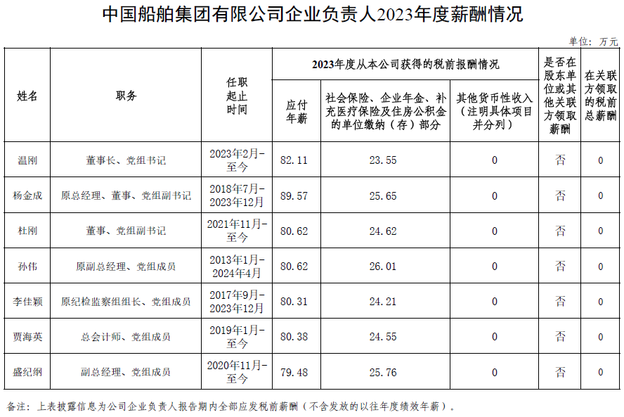 中國(guó)船舶集團(tuán)有限公司企業(yè)負(fù)責(zé)人2023年度薪酬情況