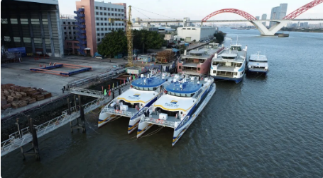 2020年12月30日,中國(guó)船舶集團(tuán)旗下遠(yuǎn)舟公司所屬英輝南方造船(廣州番禺)有限公司建造的“新海韻”號(hào)、“新海駿”號(hào)兩艘鋁合金雙體高速客船,同時(shí)在廣州市番禺區(qū)英輝南方碼頭順利交付。“新海韻”、“新海駿”是英輝南方為船東建造的藍(lán)色干線系列高速客船的第8和第9艘,船長(zhǎng)42.8米,寬10.3米,載客199人,設(shè)計(jì)航速35節(jié)。遠(yuǎn)舟公司所屬英輝南方在鋁合金高速客船第三代船型基礎(chǔ)上,開(kāi)展技術(shù)創(chuàng)新和船型優(yōu)化,開(kāi)發(fā)完成了“新海韻”、“新海駿”為代表的第四代新船型。