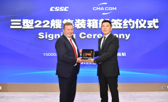 4月30日,中國船舶集團(tuán)旗下中船貿(mào)易攜手江南造船、滬東中華、北船重工聯(lián)合承接法國達(dá)飛海運(yùn)集團(tuán)3型22艘集裝箱船訂單,中國船舶集團(tuán)黨組成員、副總經(jīng)理孫偉,達(dá)飛集團(tuán)執(zhí)行副總裁澤維爾出席簽約儀式。