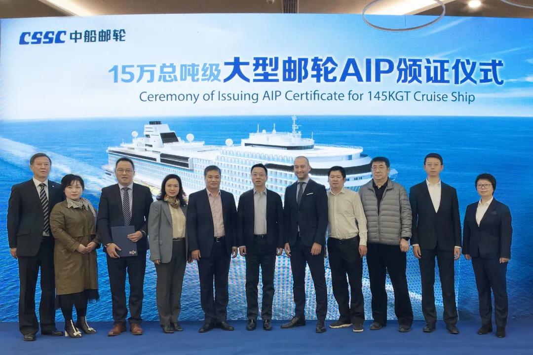 12月9日,中國船舶集團旗下中船郵輪自主研發(fā)設(shè)計的15萬總噸級大型郵輪獲得意大利船級社原則性認(rèn)可(AIP)證書。這是中國首次獨立自主研發(fā)設(shè)計的完全擁有自主知識產(chǎn)權(quán)的大型郵輪,一舉打破國外在該領(lǐng)域長期技術(shù)封鎖和壟斷,開啟中國大型郵輪自主設(shè)計新時代。中國船舶集團黨組成員、副總經(jīng)理盛紀(jì)綱出席授證儀式并講話。