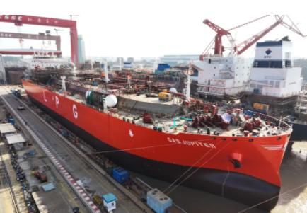 2月15日,在4號塢率先出塢的是江南造船為廣東九豐能源集團有限公司建造的國內(nèi)首制79800立方米Mark III型薄膜式液化天然氣(LNG)運輸船,以及為天津西南海運有限公司建造的93000立方米超大型液化氣船(VLGC)首制船;同時起浮的還有93000立方米VLGC后續(xù)半船和即將移位至3號塢的24100TEU超大型集裝箱船的艏部巨型環(huán)段。同批次的后續(xù)作業(yè)將轉(zhuǎn)移到3號塢,預(yù)計在2月24日,江南造船為地中海航運(MSC)建造的24100TEU超大型集裝箱船系列第二艘(H2733船)以及為新加坡Petredec公司建造的93000立方米VLGC系列第二艘(H2736船)出塢,后續(xù)兩艘半船同步起浮。