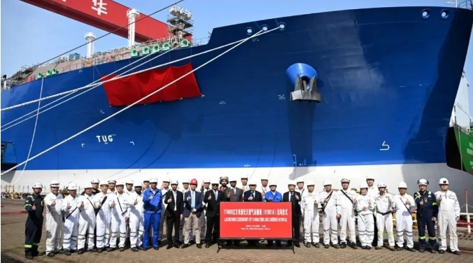 17.4萬立方米LNG運(yùn)輸船“遠(yuǎn)海奮進(jìn)”號(hào)(Ocean Inspiration)在滬東中華新廠區(qū)正式命名。