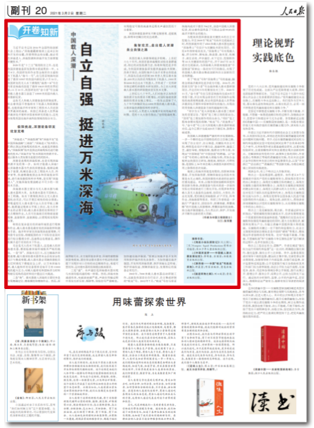 3月2日,人民日報 “開卷知新” 專欄刊發(fā)“蛟龍?zhí)枴笨傇O(shè)計師中國工程院院士中國船舶集團七〇二所研究員徐芑南文章《中國載人深潛——自立自強 挺進(jìn)萬米深?!?。