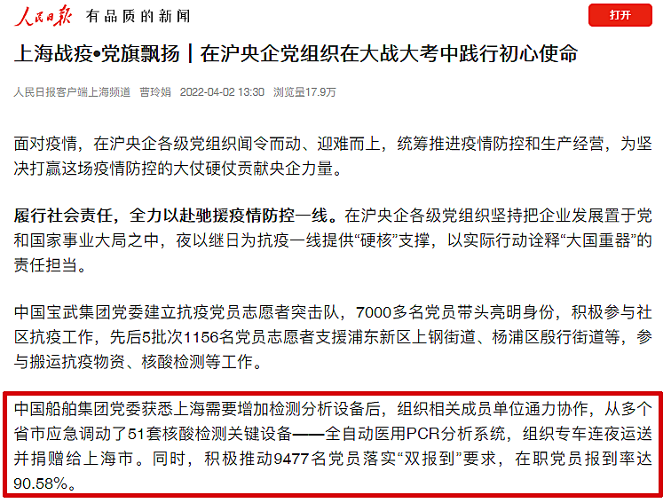 “中國(guó)船舶集團(tuán)黨組獲悉上海需要增加檢測(cè)分析設(shè)備后,組織相關(guān)成員單位通力協(xié)作,從多個(gè)省市應(yīng)急調(diào)動(dòng)了51套核酸檢測(cè)關(guān)鍵設(shè)備——全自動(dòng)醫(yī)用PCR分析系統(tǒng),組織專(zhuān)車(chē)連夜運(yùn)送并捐贈(zèng)給上海市。同時(shí),積極推動(dòng)9477名黨員落實(shí)‘雙報(bào)到’要求,在職黨員報(bào)到率達(dá)90.58%?!?/p>