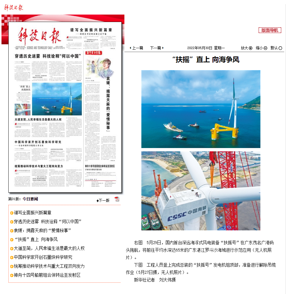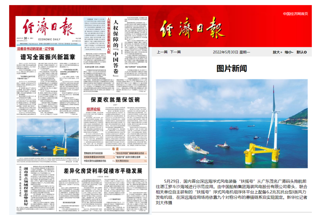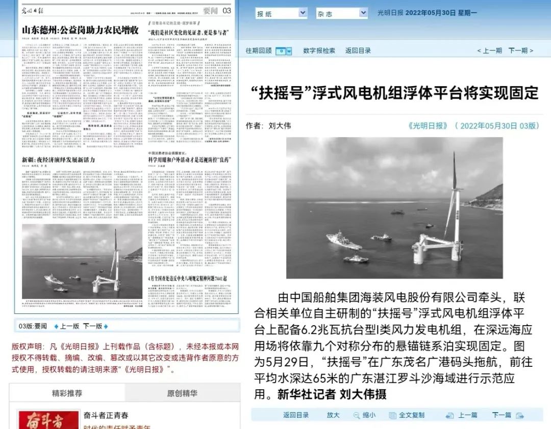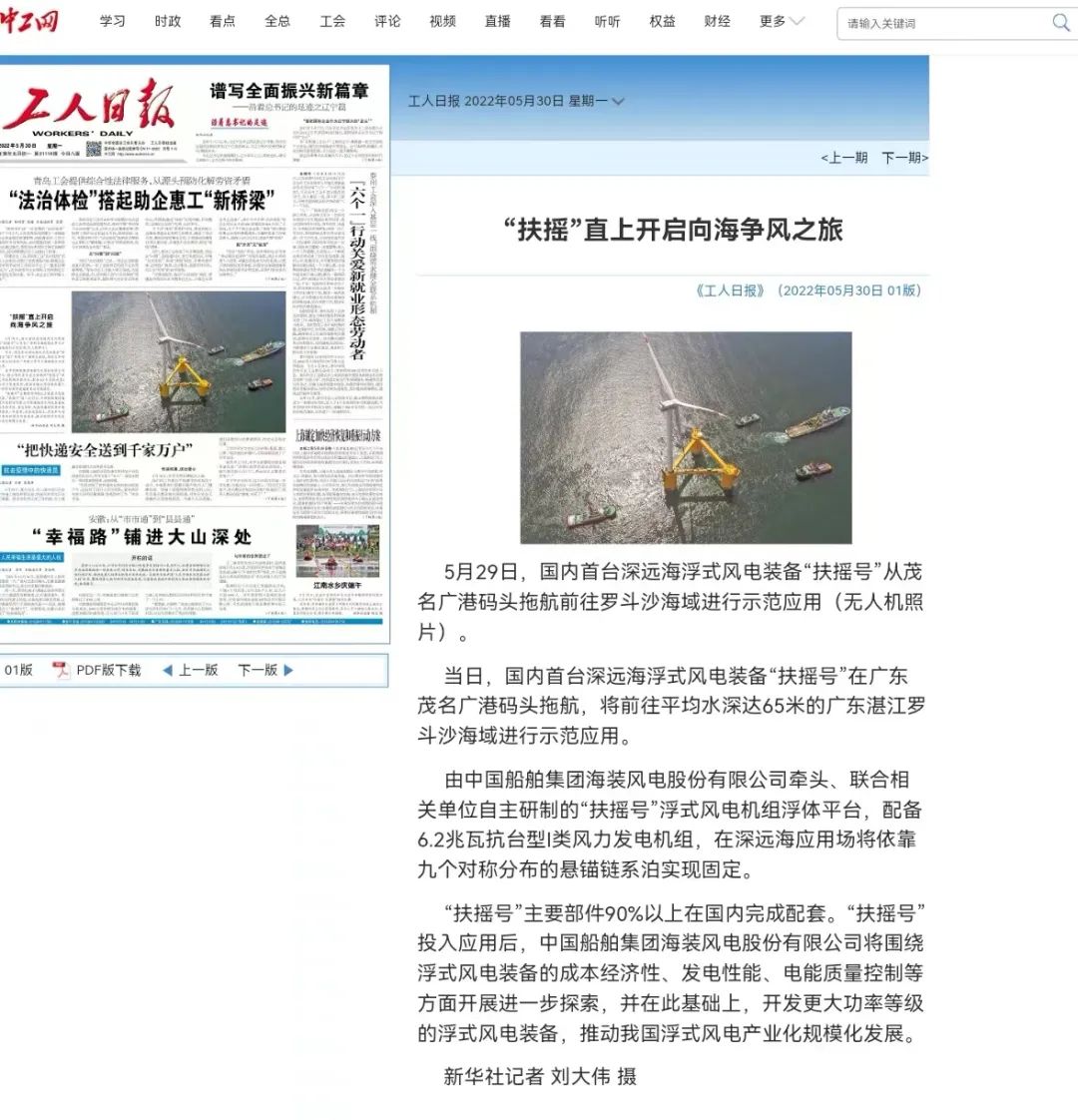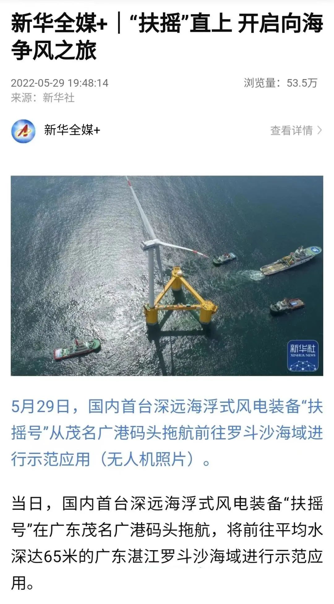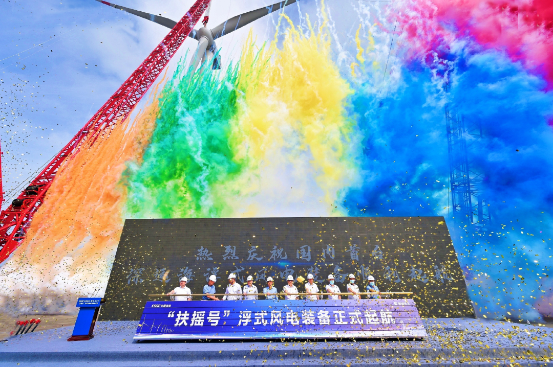5月29日,中國船舶集團(tuán)旗下中國海裝牽頭研制的國內(nèi)首臺(tái)深遠(yuǎn)海浮式風(fēng)電裝備——“扶搖號(hào)”從廣東茂名碼頭起航,前往平均水深65米的廣東湛江附近海域投入示范應(yīng)用。