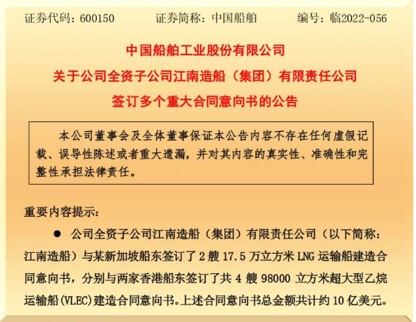 10月25日,中國船舶集團(tuán)有限公司旗下上市公司中國船舶工業(yè)股份有限公司發(fā)布《關(guān)于公司全資子公司江南造船(集團(tuán))有限責(zé)任公司簽訂多個(gè)重大合同意向書》的公告。根據(jù)公告,江南造船共與相關(guān)船東簽署了2型6艘約10億美元新船建造合同意向書。