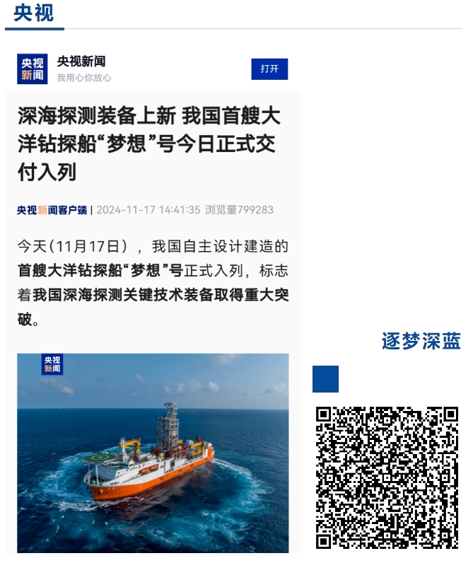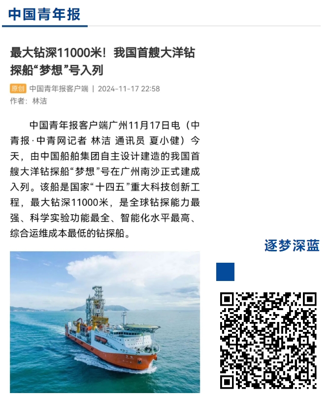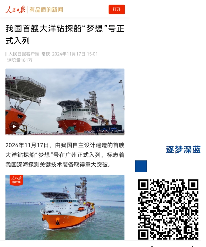 11月17日,中國(guó)船舶集團(tuán)自主設(shè)計(jì)建造的我國(guó)首艘大洋鉆探船“夢(mèng)想”號(hào)在廣州南沙交付入列,人民日?qǐng)?bào)、新華社、央視等媒體的記者來到交付現(xiàn)場(chǎng)進(jìn)行報(bào)道 。