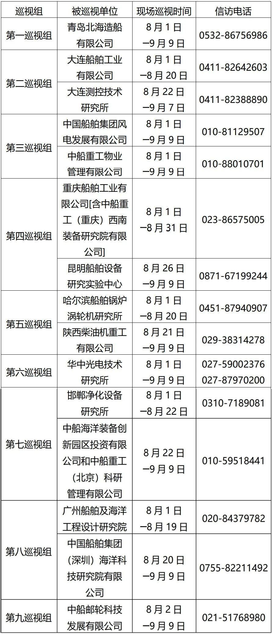 根據(jù)中國船舶集團黨組2022年第一輪巡視工作部署,截至2022年8月2日,中國船舶集團黨組9個巡視組已進駐青島北海造船有限公司、大連船舶工業(yè)有限公司、中國船舶集團風電發(fā)展有限公司、中船重工物業(yè)管理有限公司、重慶船舶工業(yè)有限公司[含中船重工(重慶)西南裝備研究院有限公司]、哈爾濱船舶鍋爐渦輪機研究所、華中光電技術(shù)研究所、邯鄲凈化設備研究所、廣州船舶及海洋工程設計研究院、中船郵輪科技發(fā)展有限公司等單位,對其黨組織開展為期40天左右的現(xiàn)場巡視。巡視期間,巡視組設置專門值班電話(具體如下表)。同時在巡視組工作現(xiàn)場設置聯(lián)系信箱,廣大干部職工可以反映情況。