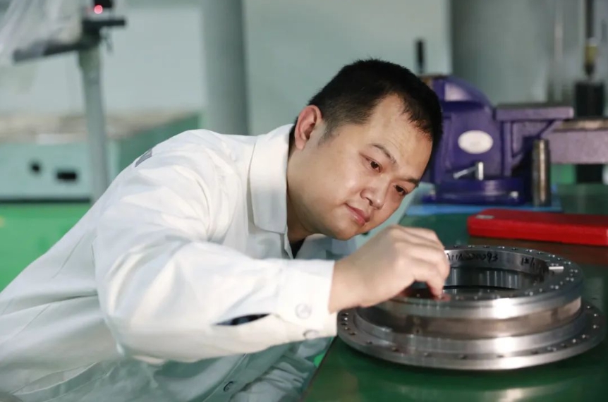 “必須持之以恒地以精益求精、精雕細琢的工匠精神打造所經(jīng)手的每個產(chǎn)品!”這是周虎常提的一句話。燃氣輪機機匣零組件制造精度要求高,裝配質量控制嚴,其加工、裝配工藝技術代表機械制造行業(yè)的先進水平。武漢船機首套燃氣輪機機匣產(chǎn)品裝配工作由周虎帶領班組成員進行,其高超的技能水平保障了產(chǎn)品的裝配質量與進度。在25兆瓦燃氣輪機過渡段機匣葉片裝配過程中,因葉片與機匣外環(huán)裝配為燕尾槽式的榫接結構,葉片榫頭與燕尾榫槽三面的接觸面積要求高達80%以上,需由鉗工拂配以達該指標。葉片榫頭拂配過程中,周虎采用銼刀銼削裝配面,利用其長期磨練掌握的良好手感,將銼削量誤差控制在0.005-0.01毫米,大大減少了葉片試裝配次數(shù),裝配效率顯著提升。